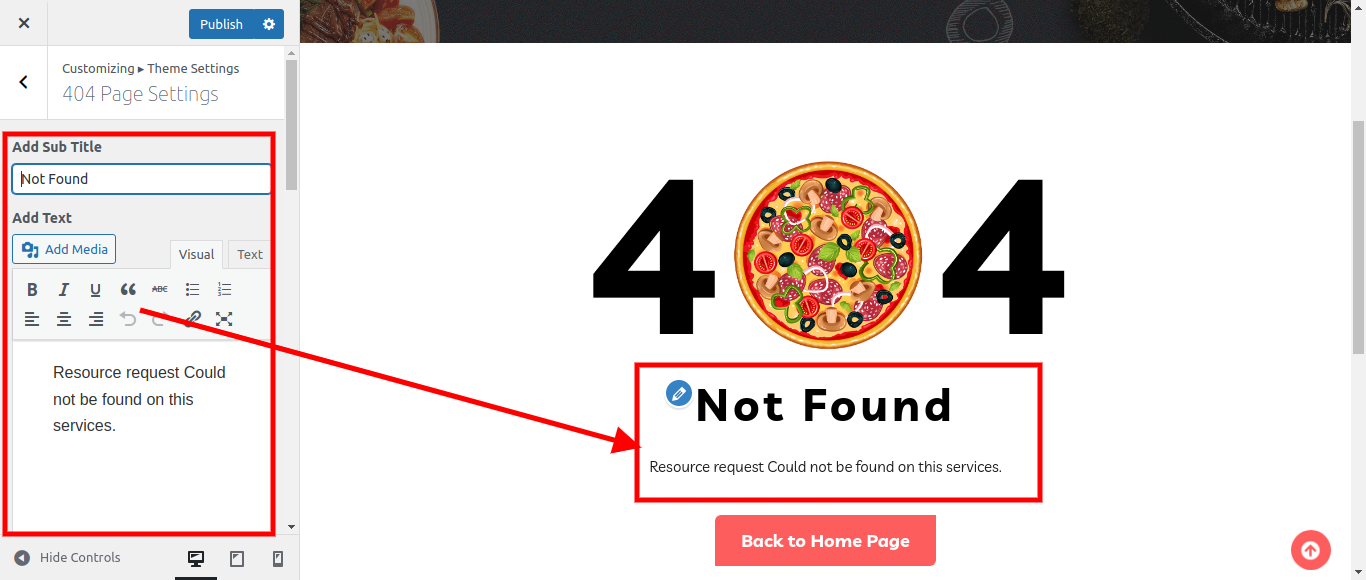 Go to Appearance -> Customize -> Theme Settings -> 404 Page