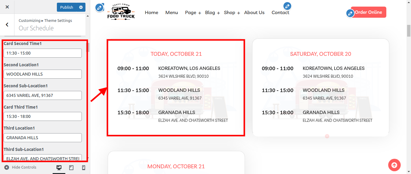 Go to Appearance >>Customize >> Theme Settings >> our schedule